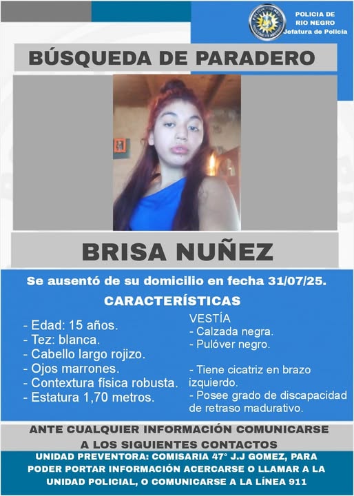 General Roca – Con la intervención de la Defensoría de Menores de turno, se ha activado el protocolo de búsqueda para dar con el paradero de Brisa Nuñez, una adolescente de 15 años de edad cuya imagen ya fue difundida oficialmente para colaborar en su localización.